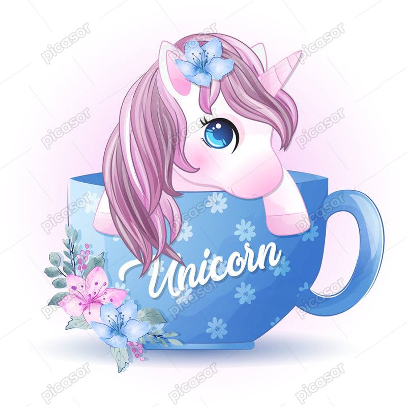 وکتور اسب تک شاخ کوچولو داخل فنجان آبی، وکتور شخصیت کارتونی حیوانات