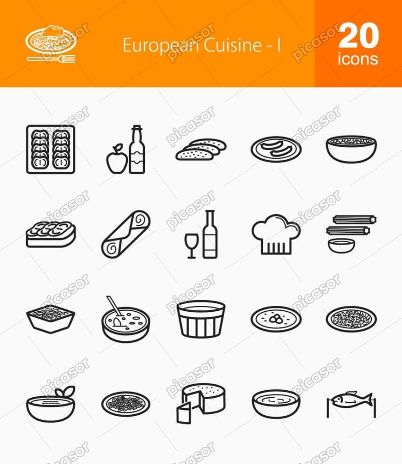 20 وکتور آیکون غذاهای اروپایی طرح مینیمال خطی