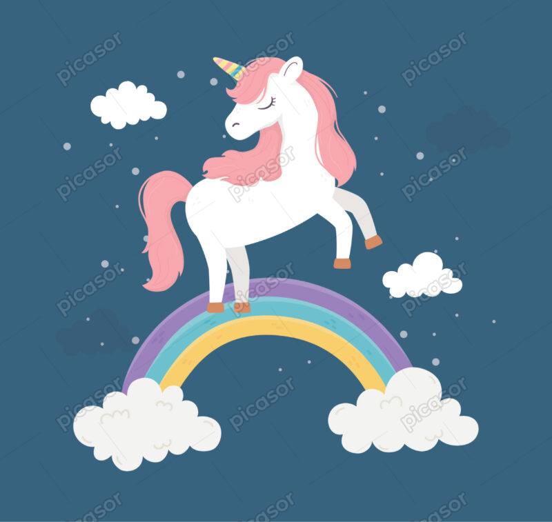وکتور اسب تک شاخ کارتونی نقاشی و رنگین کمان